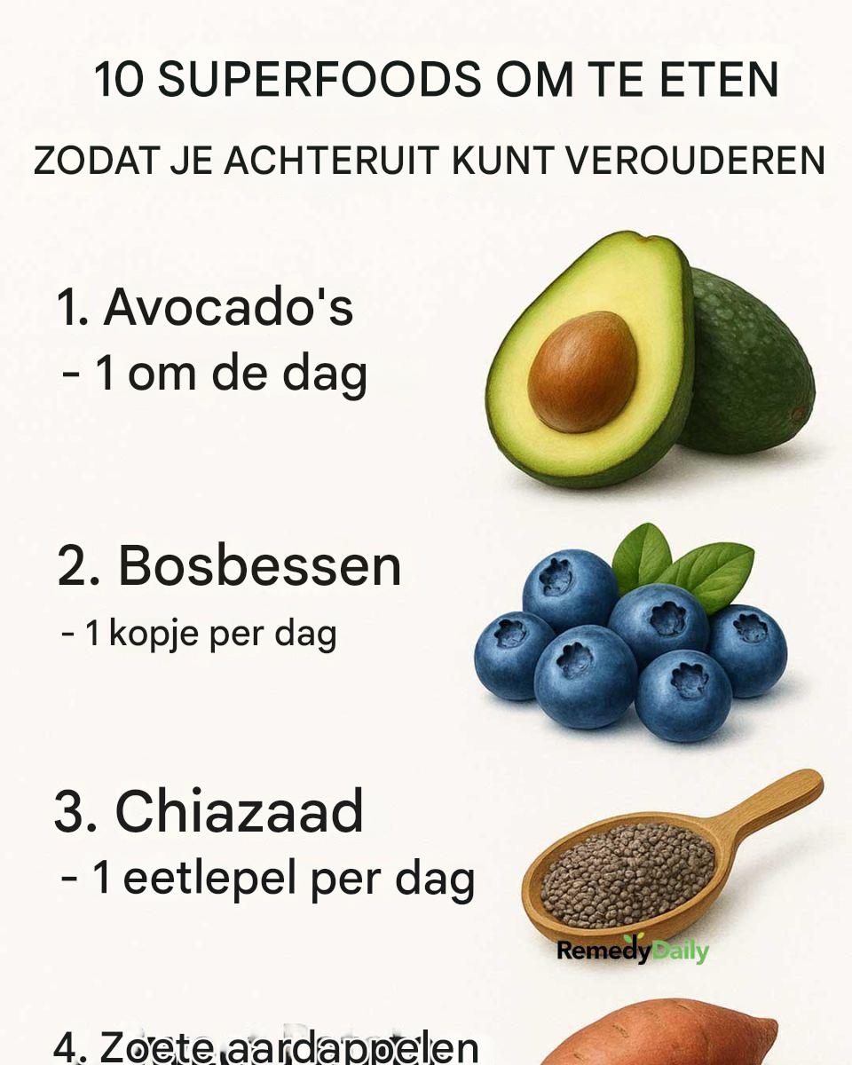 In dit artikel verkennen we tien superfoods die geroemd worden om hun anti-verouderingseigenschappen. Door deze voedingsmiddelen in je dieet op te nemen, kun je hun krachtige voedingsstoffen benutten om op een natuurlijke manier ouder te worden en je huid, hersenen, hart en algehele welzijn te ondersteunen. Van de romige rijkdom van avocado’s tot de levendige kleuren van kurkuma, elk van deze superfoods biedt unieke voordelen die je kunnen helpen de tijd op natuurlijke wijze terug te draaien.