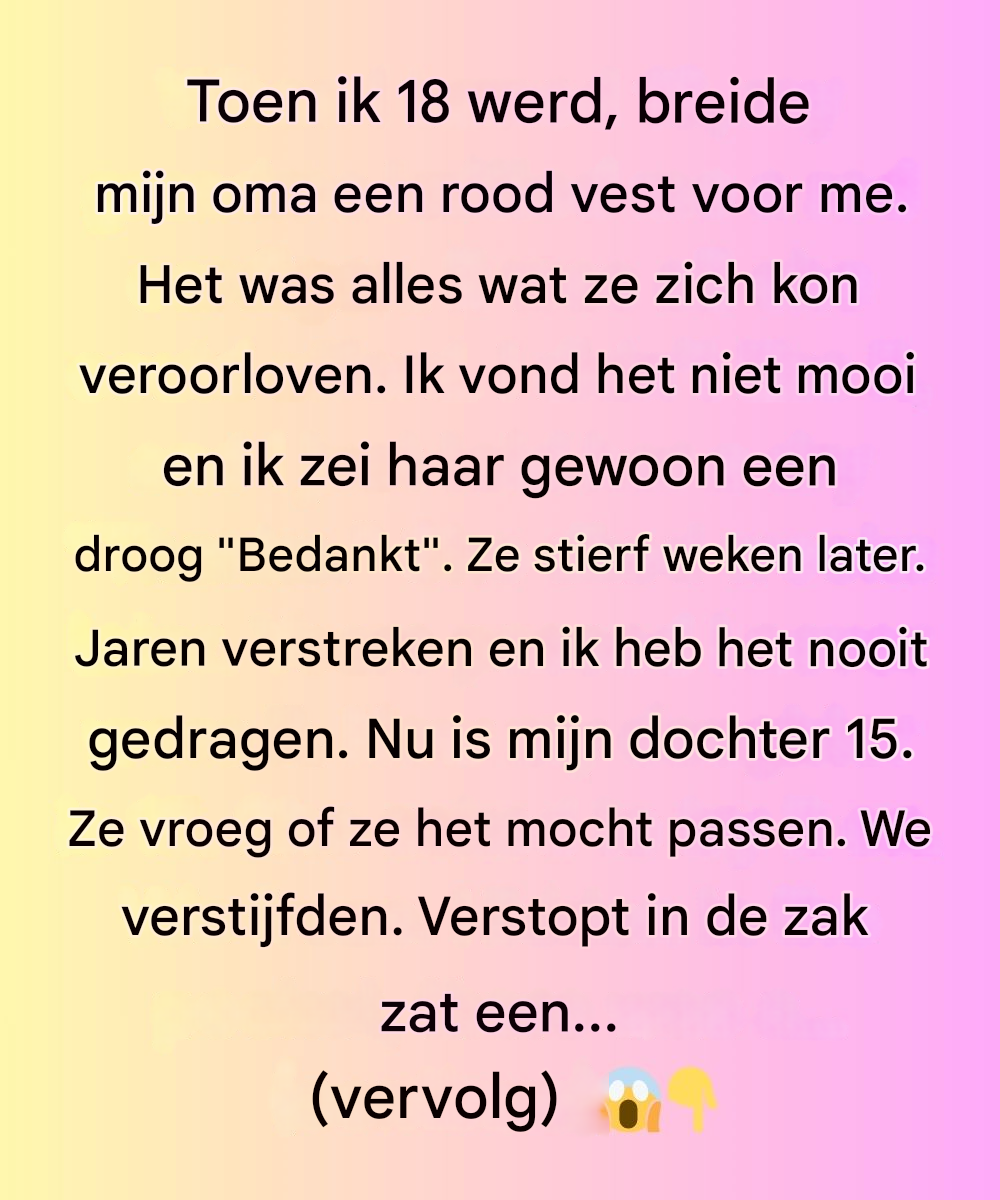 Toen ik 18 werd, breide mijn oma een rood vest voor me. Het was alles wat ze zich kon veroorloven. Ik vond het niet mooi en zei haar gewoon een droog “Bedankt”. Weken later stierf ze.