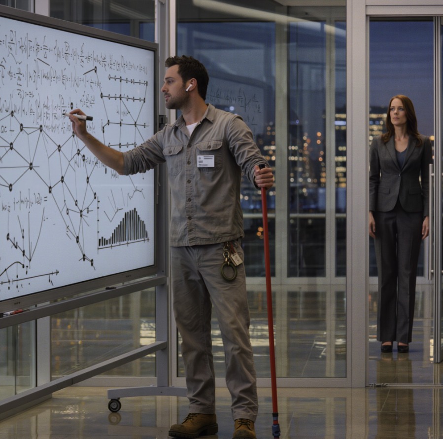 In de gang gleed een vervaagd grijs uniform langs een overvolle vuilnisbak. Daniel Hayes bukte zich om het blikje frisdrank op te rapen, duwde het vakkundig in het mandje, ging toen rechtop staan en liep verder. Eén oortje hing aan zijn linkeroor, het andere zat erin. Het uiterlijk van de nachtschoonmaker was niet erg theatraal: versleten schoenen, een stapel sleutels, een karretje dat op één wiel kraakte. Maar toen hij langs de glazen wand van de vergaderruimte liep, viel zijn blik op het whiteboard binnenin.