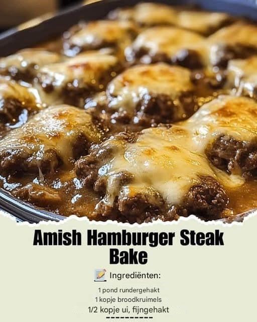Hier is een warm en hartig recept voor een Amish Hamburger Steak Bake die eenvoudige, rustieke smaken direct op tafel brengt. Perfect voor gezellige avonden, combineert dit gerecht malse laagjes gekruid rundergehakt, dun gesneden aardappelen en een romige soepmix, allemaal bedekt met gesmolten cheddar. Het is een troostmaaltijd die makkelijk te maken is, heerlijk vullend en een hit bij het hele gezin. Of het nu voor een doordeweekse avond is of een weekendbijeenkomst, dit recept legt de huiselijke goedheid van de klassieke Amish keuken vast. Eet smakelijk!