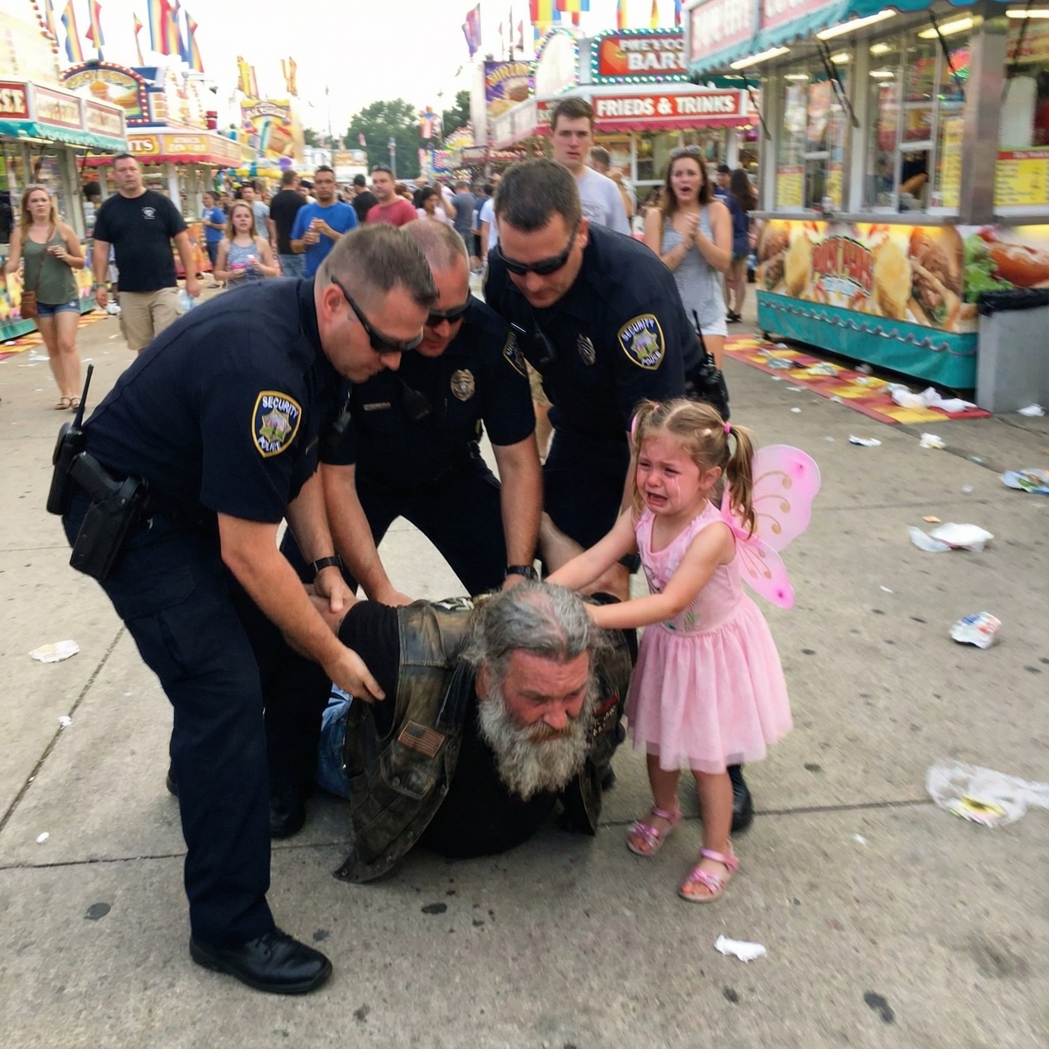 Het kleine meisje schreeuwde « Dat is mijn opa! » terwijl de politie de motorrijder tegen de grond drukte, in de veronderstelling dat hij het kind aan het ontvoeren was.
