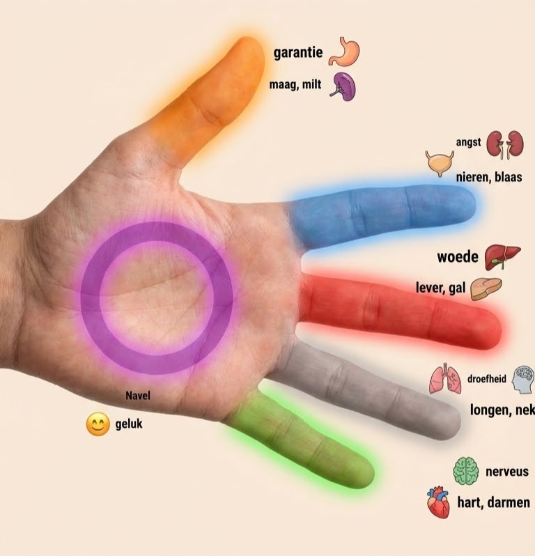 Het basisidee achter deze filosofie is dat elke vinger verbonden is met een specifiek orgaan en een specifieke emotie. Als u ervoor kiest om een specifiek orgaan te behandelen, druk dan 3 tot 5 minuten op het corresponderende punt op uw hand en probeer te ontspannen.