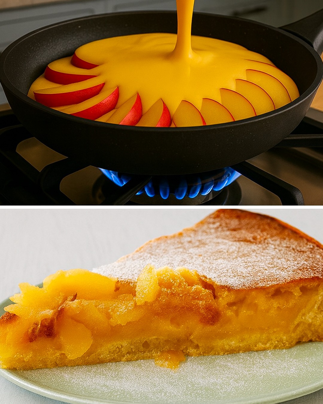 Deze cake wordt direct op het fornuis gebakken en heeft een zachte en luchtige textuur, versterkt door de natuurlijke zoetheid van seizoensperziken .