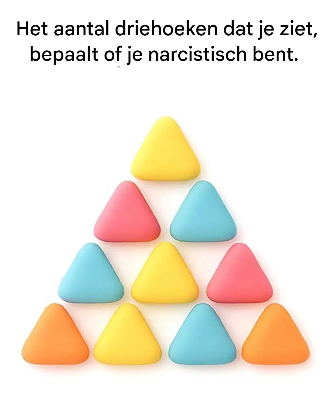 Op het eerste gezicht lijkt de afbeelding onschuldig: een paar gekleurde driehoeken opgestapeld als een geometrische puzzel voor kinderen. Maar als je beter kijkt, vervaagt de eenvoud. Sommigen tellen er 9, anderen 13, en weer anderen meer dan 20. Wat als deze visuele puzzel niet alleen een kwestie van wiskunde was… maar van psychologie?