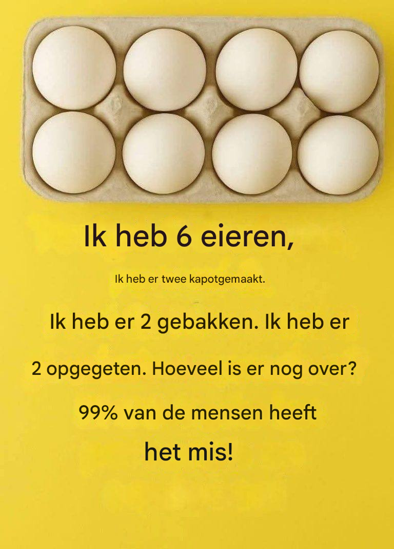 🤯 En inderdaad! De meeste gebruikers geven zonder na te denken een verkeerd antwoord. Sommigen zeggen dat er 0 eieren over zijn, anderen 4, weer anderen 2… maar wat is het juiste antwoord?