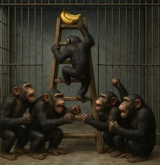 🧠Hoe creëer je een natie van idioten? 🧪In een beroemd experiment plaatsten wetenschappers vijf apen in een kooi. In het midden van de kooi stond een ladder, 🪜en daarbovenop lagen bananen 🍌💦Elke keer dat een aap de ladder probeerde te beklimmen om een ​​banaan te pakken, besproeiden de wetenschappers de anderen met koud water. 🙈Dus begonnen de apen degenen die probeerden te klimmen te slaan, zodat ze niet allemaal gestraft zouden worden. En na verloop van tijd stopten ze helemaal met proberen.