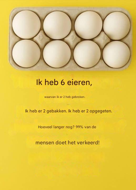 “Ik heb 6 eieren. Ik heb er 2 gebroken. Ik heb er 2 gebakken. Ik heb er 2 opgegeten. Hoeveel eieren heb ik nog over?”