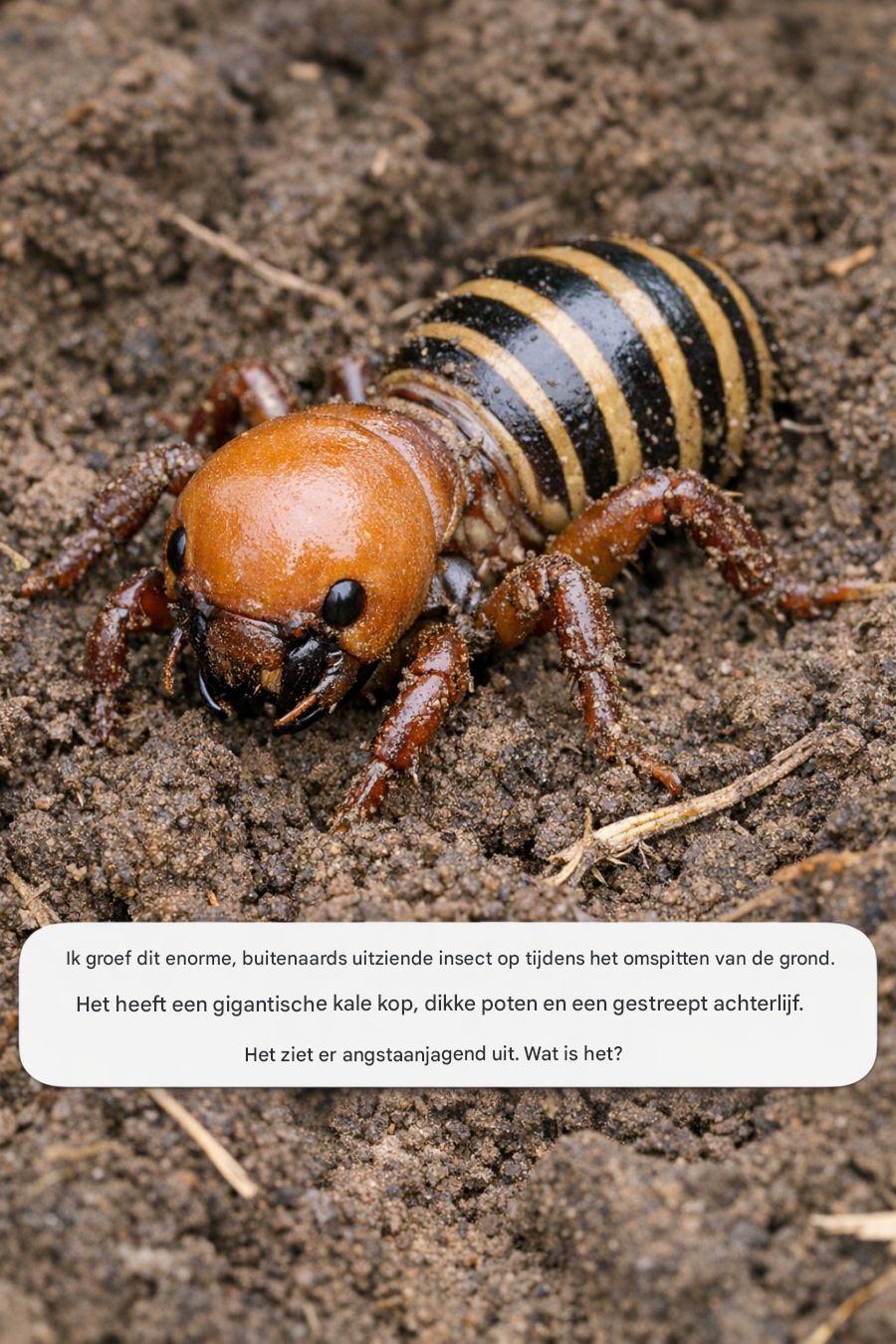 Ik groef dit enorme, buitenaards uitziende insect op tijdens het omspitten van de grond. Het heeft een gigantische kale kop, dikke poten en een gestreept achterlijf. Het ziet er angstaanjagend uit. Wat is het?