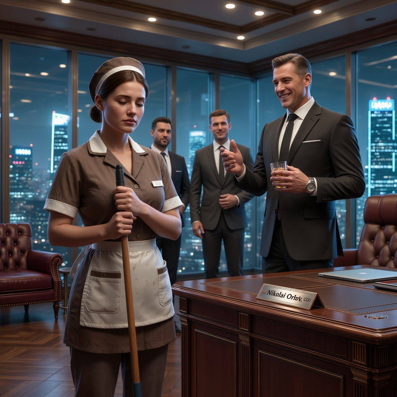 Het schoonmaakbedrijf nam me aan na een vluchtige blik op mijn handen en een langere blik op mijn rug. Nachtdiensten in een glazen toren genaamd G4 Holding in Moskou-Stad. De supervisor had een mond die teleurstelling uitstraalde. « Bruin uniform, niet praten met directieleden, » zei ze. « Alleen schoonmaken. »