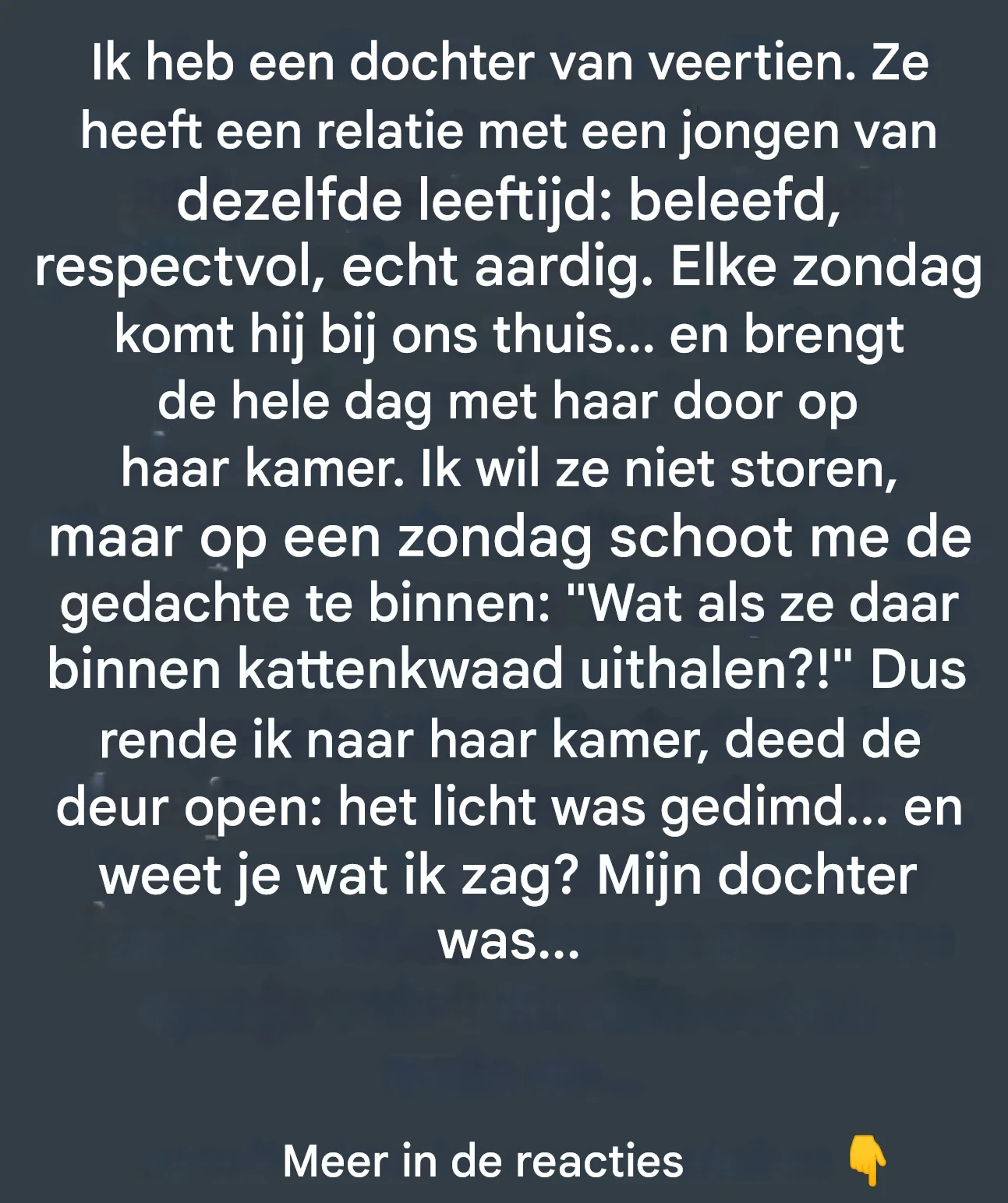 Ik heb mezelf altijd gezien als een zelfverzekerde moeder. Niet opdringerig, niet het type dat stiekem in een persoonlijk dagboek bladert of mijn kinderen ondervraagt alsof ik een onderzoek uitvoer. Ik heb altijd gewild dat Lina opgroeit in een vredige omgeving, waar ze kan ademen, zich kan ontwikkelen en zichzelf kan uiten. Maar die zondag verbrijzelde iets mijn zekerheden. Een uitbarsting van gelach achter haar gesloten deur, een bijna onhoorbaar gefluister… en mijn gedachten begonnen scenario’s te verzinnen die geen enkele basis in de werkelijkheid hadden.