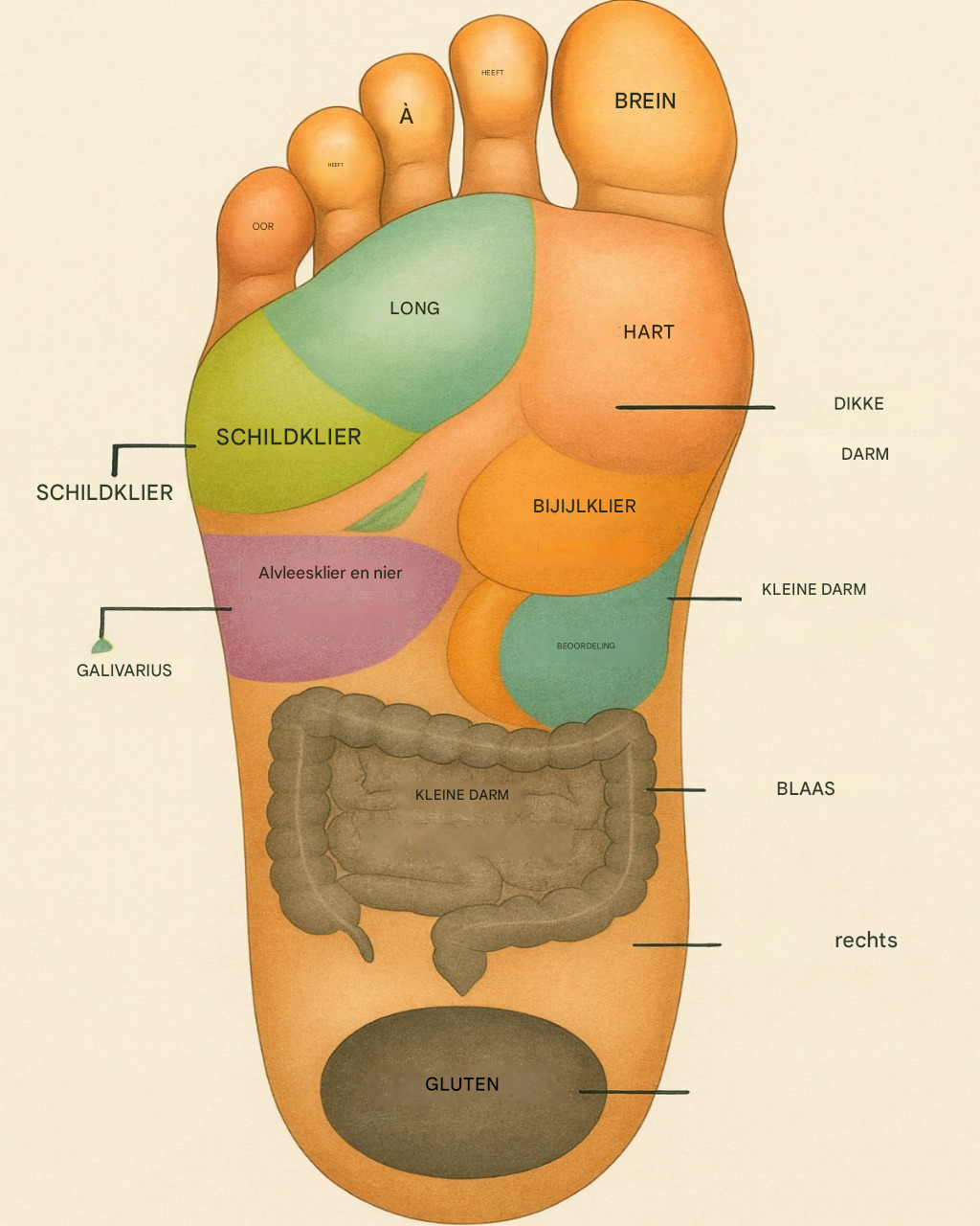 De voetzolen bevatten honderden zenuwuiteinden , die verbonden zijn met verschillende organen in het lichaam (zoals weergegeven op de reflexologiekaart hierboven). Volgens de traditionele geneeskunde: