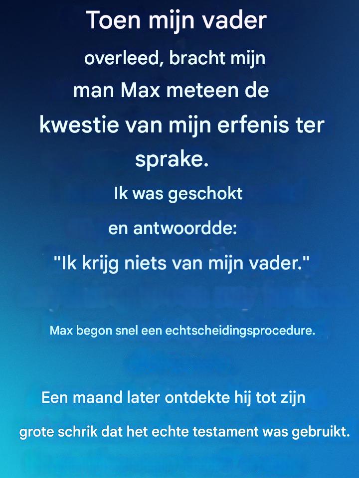 In die moeilijke en kwetsbare dagen deed mijn man Max iets wat ik me nooit had kunnen voorstellen. Slechts een paar dagen na de begrafenis – terwijl ik nog steeds condoleancekaarten en half opgegeten ovenschotels van de buren aan het sorteren was – vroeg hij me naar mijn erfenis. Geen inleiding. Geen genegenheid. Gewoon een kortaf: “Dus… heeft hij je iets nagelaten?”
