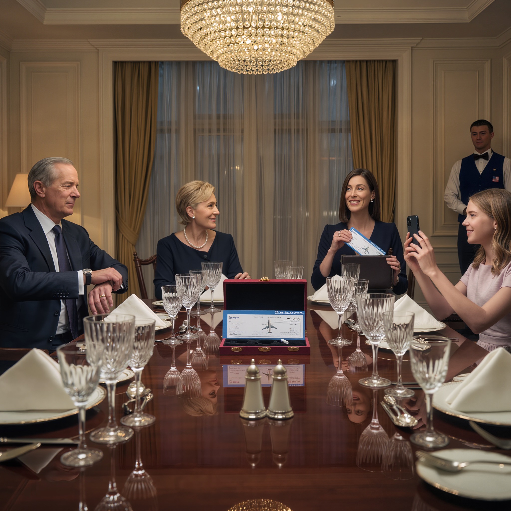 Eleanor schuift een slank fluwelen doosje over de tafel, het soort doosje waar normaal gesproken sieraden in worden bewaard. Haar vingers laten het precies tussen de peper- en zoutstelletjes zitten, perfect uitgelijnd met de tafelrand.