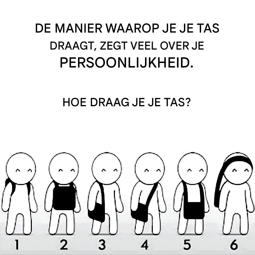 We zijn dol op al die kleine quizjes die op sociale media circuleren, vooral die waarmee je in een paar seconden een aspect van jezelf kunt ontdekken. Ze zijn luchtig, leuk, soms verrassend… en perfect voor een koffiepauze tussen vergaderingen door. De quiz van vandaag vereist geen ingewikkelde denkprocessen of lange analyses: observeer gewoon een alledaags gebaar dat je maakt zonder erbij stil te staan. Klaar? Kijk eens hoe je je tas draagt… en laat de magie zijn werk doen.