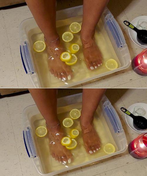 Week je voeten in een mengsel van citroen en zuiveringszout om de bloedsomloop te stimuleren, te ontgiften en te ontspannen.