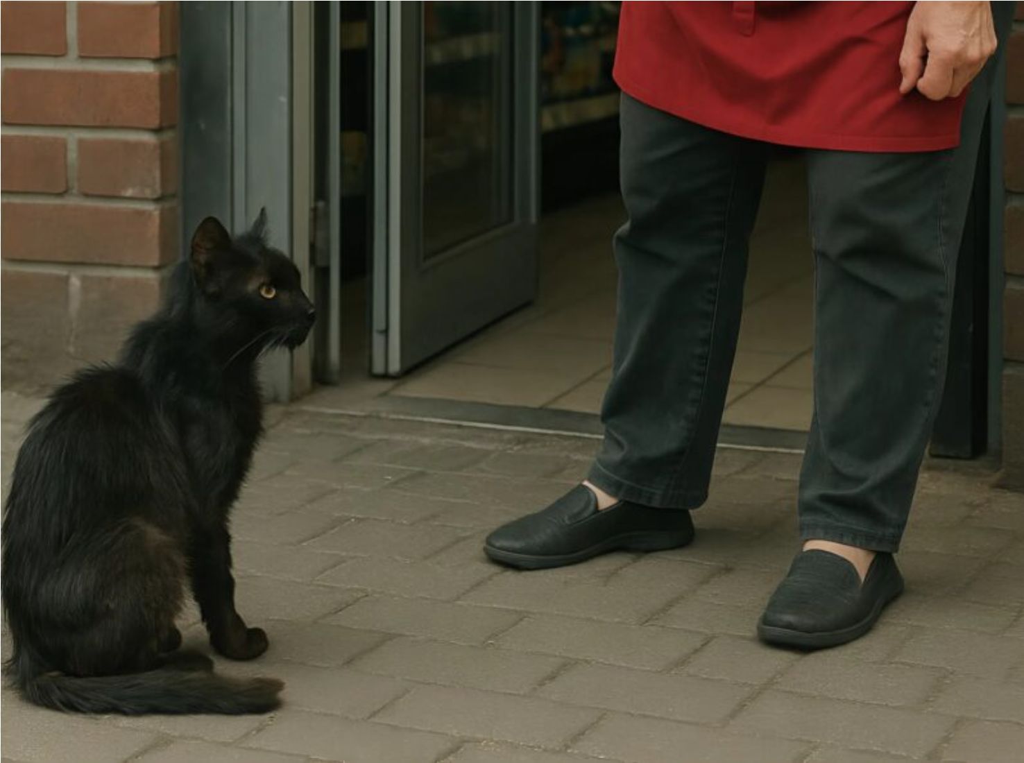 Het was een gewone avond in een kleine buurtwinkel op de hoek van een drukke straat. Voor de ingang zat een kat – mager, met doffe vacht, maar met lieve ogen waarin een voortdurende onrust te lezen was.