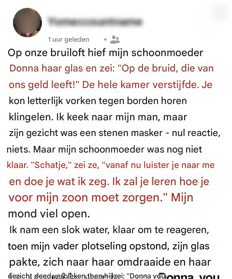 Alles veranderde toen mijn schoonmoeder, Donna, opstond om haar toost uit te brengen. Ze tikte op haar glas en glimlachte liefjes terwijl ze opstond. Toen krulden haar lippen zich in een grijns en zei ze: “Laten we het glas heffen op de bruid… die afhankelijk is van ons geld!”