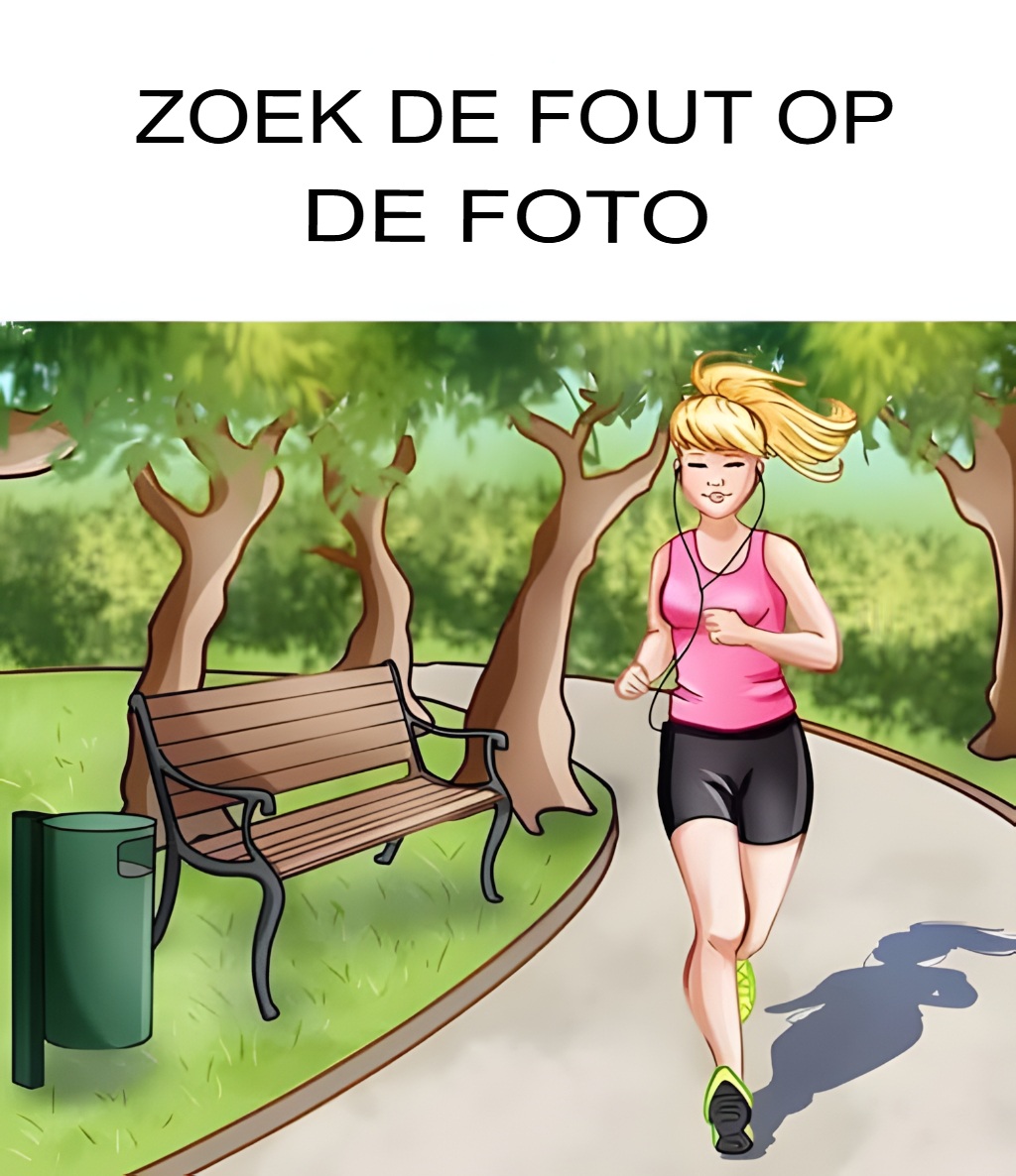 In dit raadsel is een vrouw aan het joggen in een park. Op het eerste gezicht lijkt de afbeelding normaal, maar er zit een fout in.