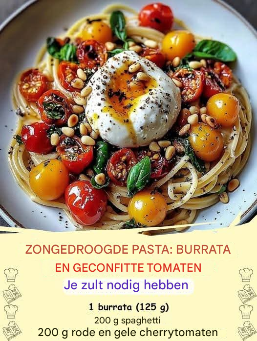 Dit recept roept de zomer, mediterrane warmte en de verfijnde eenvoud van de Italiaanse keuken op. Geroosterde tomaten in de oven geven hun zoete aroma af, terwijl burrata subtiel smelt over warme pasta. Het is een gerecht dat de zintuigen prikkelt, zelfs voordat je het proeft.
