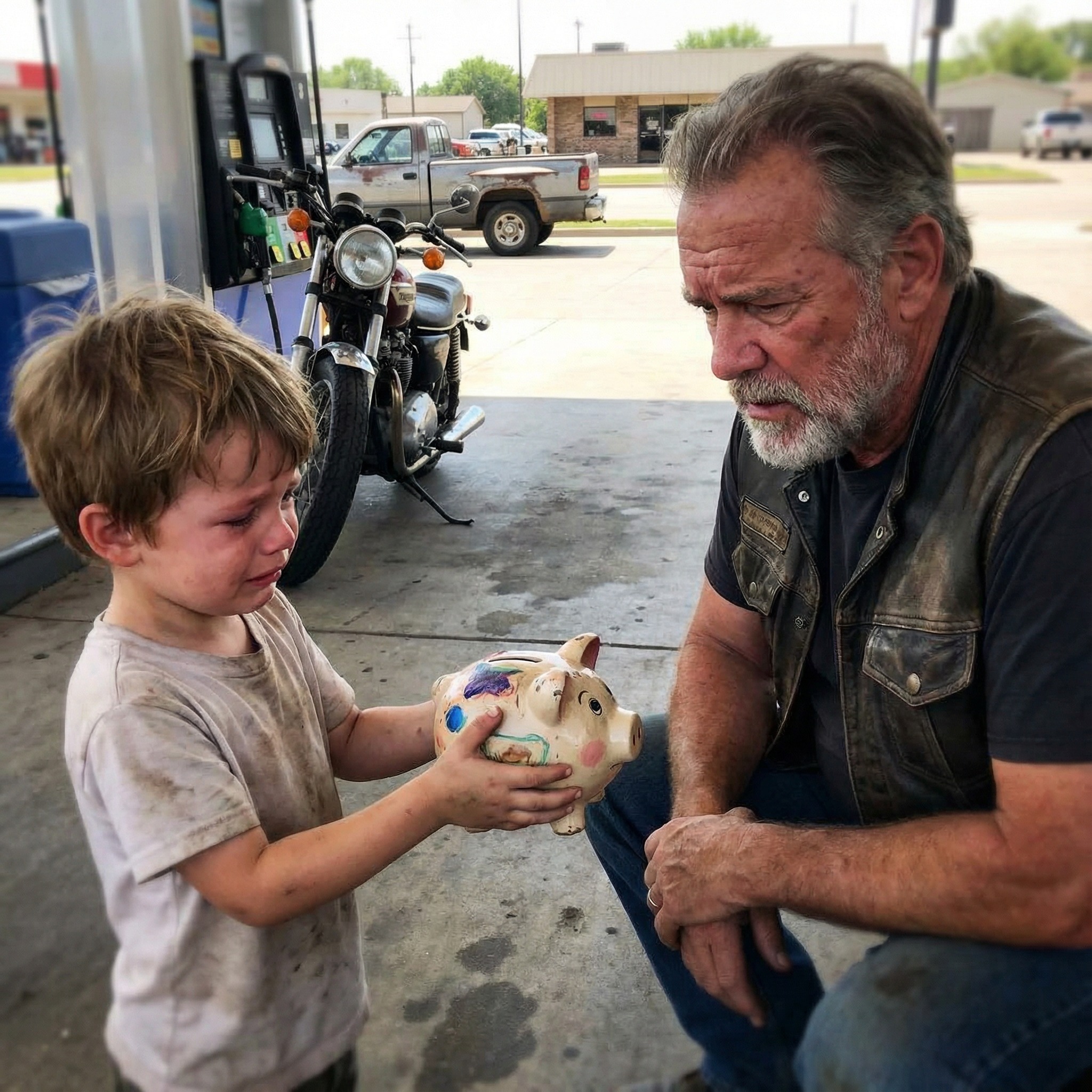 Het jongetje bood zijn spaarpot aan de motorrijder bij het tankstation en zei zes woorden die me de rillingen over de rug bezorgden: « Alsjeblieft, laat papa ophouden mama pijn te doen. » Hij was misschien vijf jaar oud, hield een keramisch varkentje vast vol krijtstrepen, de tranen stroomden over zijn wangen. Ik had net mijn Harley volgetankt toen ik kleine vingertjes aan mijn vest voelde trekken.